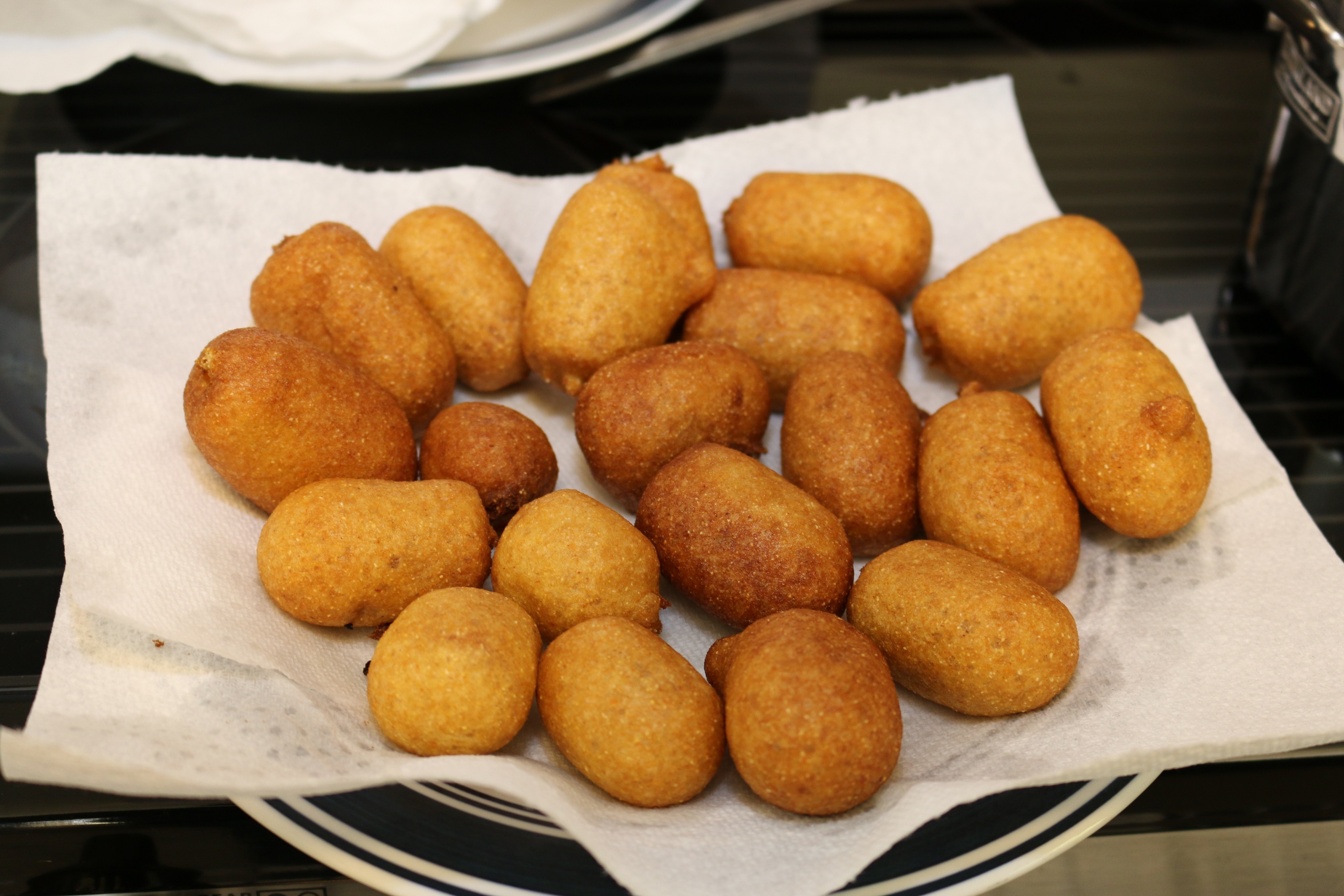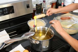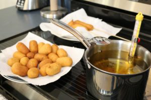 Es de suma importancia que mantengan la temperatura entre 350°F a 375°F máximo. Si la temperatura sube sobre los 375°F la mezcla de maíz no se cocina completamente y tampco se infla lo suficiente. Recomendamos el uso de un termometro como el que estamos usando en esta foto o alguno parecido. Realmente hay mejores opciones pero a mas alto precio. Aqui les dejo un enlace para que miren el termómetro que yo usé.